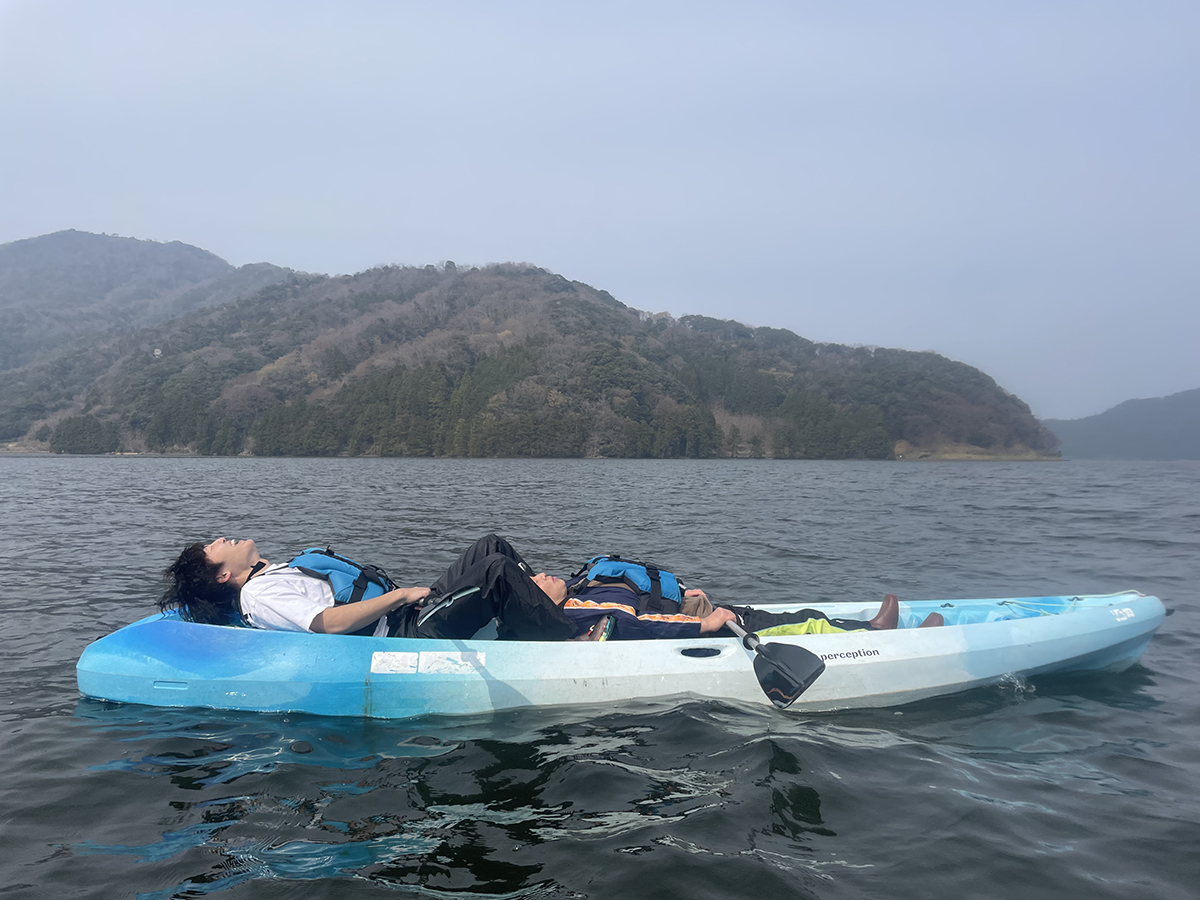その週はずっとお天気が良く、雲ひとつない青空でした。水月湖にはお客様と僕だけで、たまに遊覧船が通るくらい。本当に貸切状態です。そんなとっても大きい場所で、のーんびり過ごせる感覚は、なかなか味わえません。