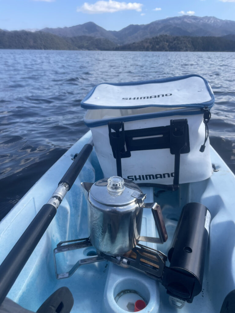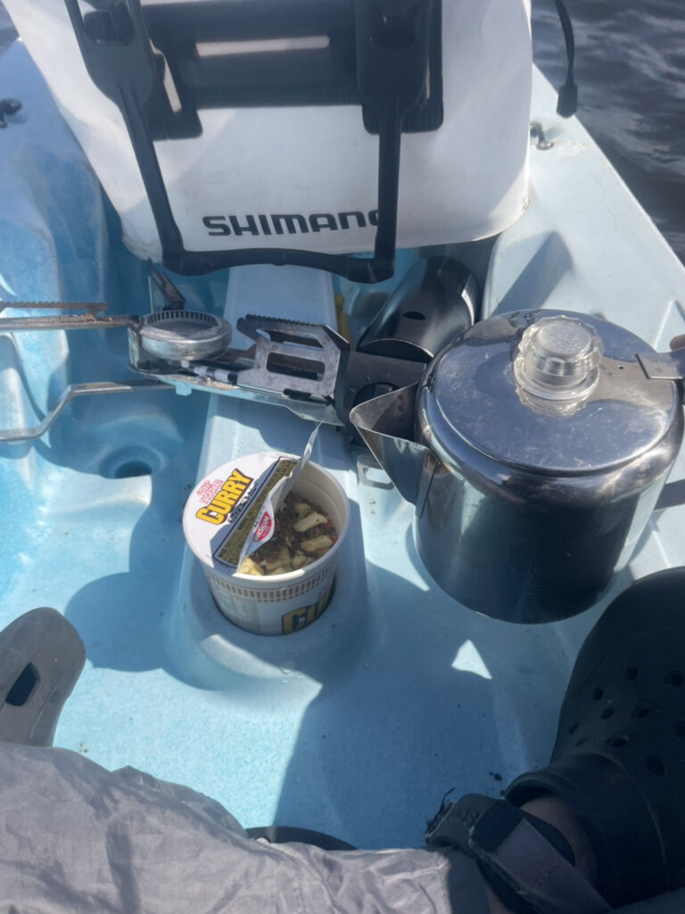 風にのんびり流されながら、しっかり沸いたお湯でカップラーメンを作り、3分待つ間にコーヒーのセッティングも済ませて、カヤックの上でランチの用意ができました!